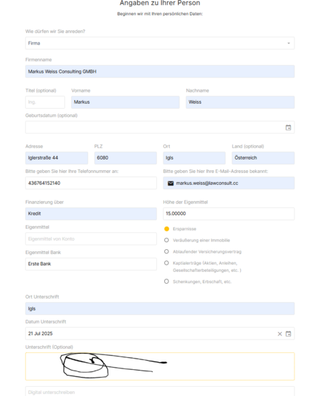 Vorteil von Webformularen: Diese können intelligent gestaltet werden. Gibt der Mandant an, als Treuhänder für eine andere Person zu handeln, können automatisch zusätzliche Felder zur Erfassung des wirtschaftlichen Eigentümers aufklappen. Die Daten werden strukturiert erfasst und können direkt weiterverarbeitet werden.